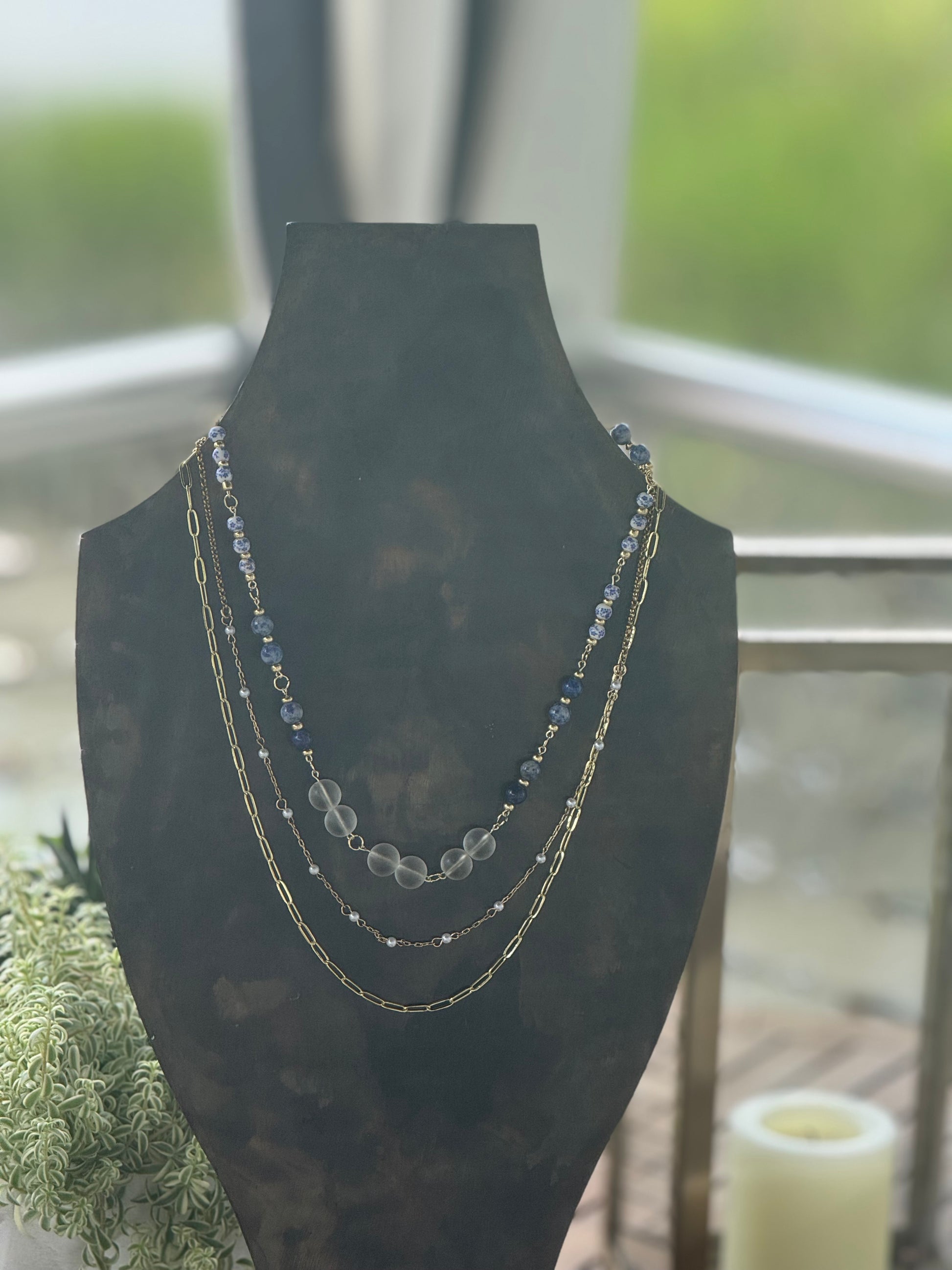 Introducing the Coastal 3 Layered Floral Necklace. With three delicate layers adorned with white, blue floral, and frosted beads, this necklace is the epitome of soft elegance. Crafted with 18k gold chains, it exudes luxury and sophistication. Perfect for any occasion, make a statement with this beautiful piece.