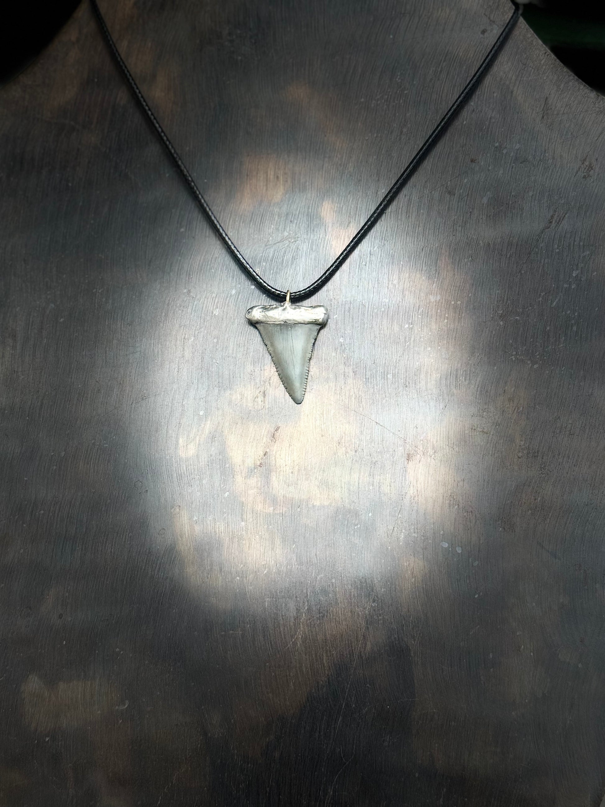 The Leather and Shark Tooth Necklace features a black leather cord paired with a durable silver clasp, providing a blend of simplicity and versatility suitable for both men and women. Its design is ideal for beach or ocean-themed attire, making it a practical accessory for casual or outdoor settings.