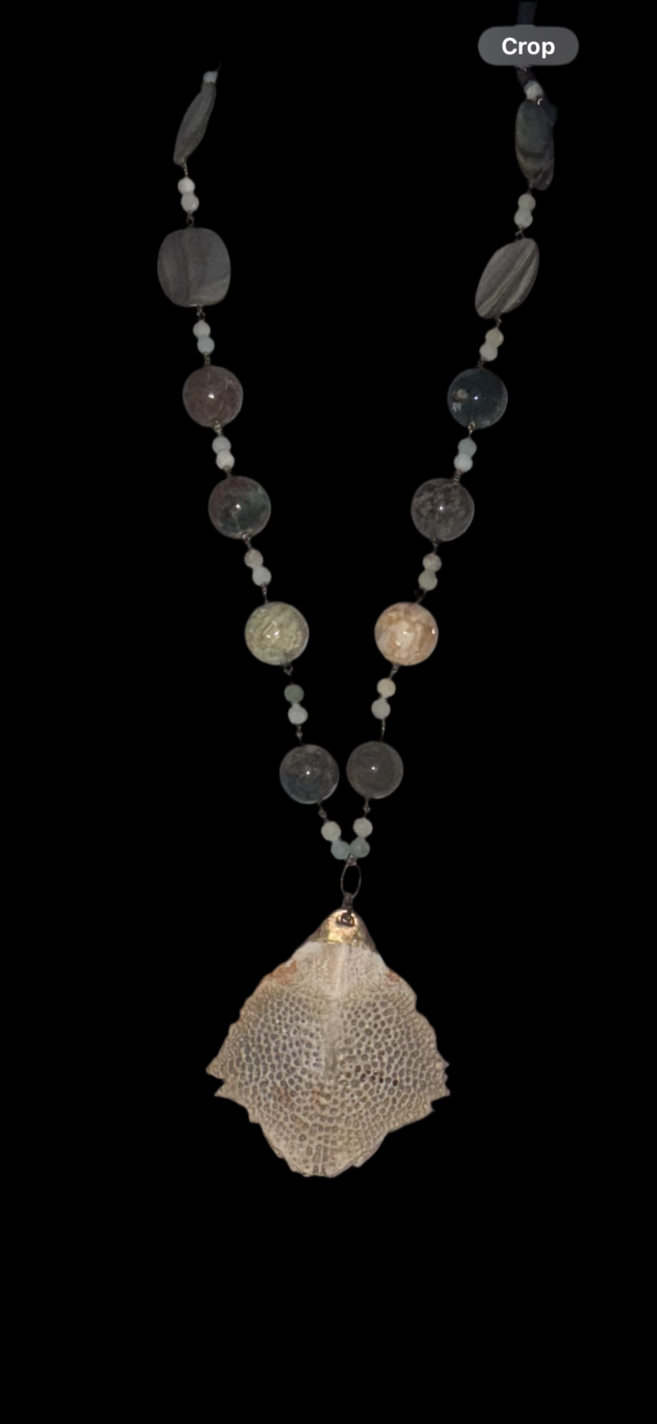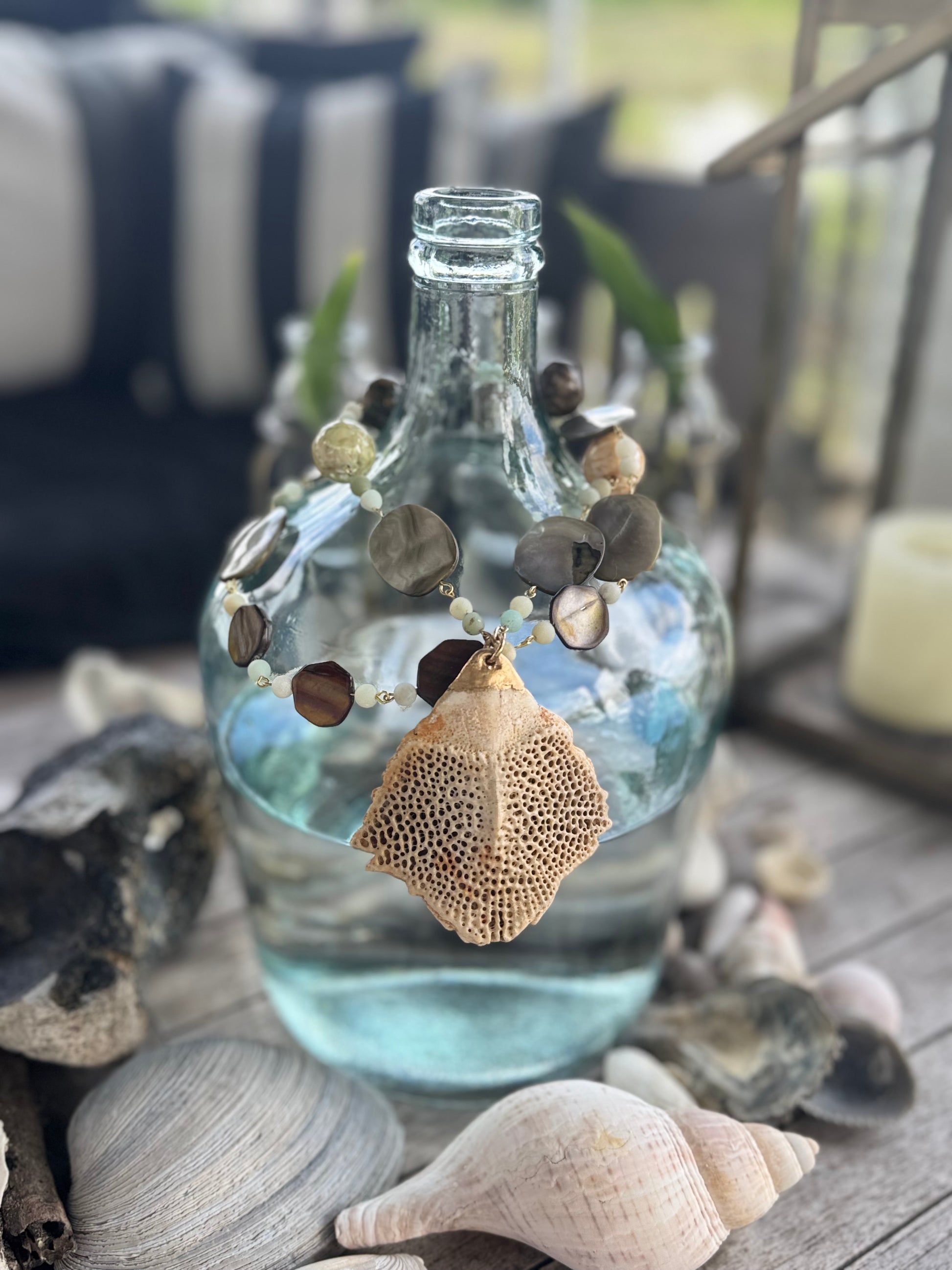 Expertly crafted with sturgeon scutes and stone beads, Scute is a unique necklace designed to showcase the beauty of nature. The 18k gold plated chain adds a touch of elegance, making it perfect for coastal styles. Embrace the serenity of the water and beaches with Scute.