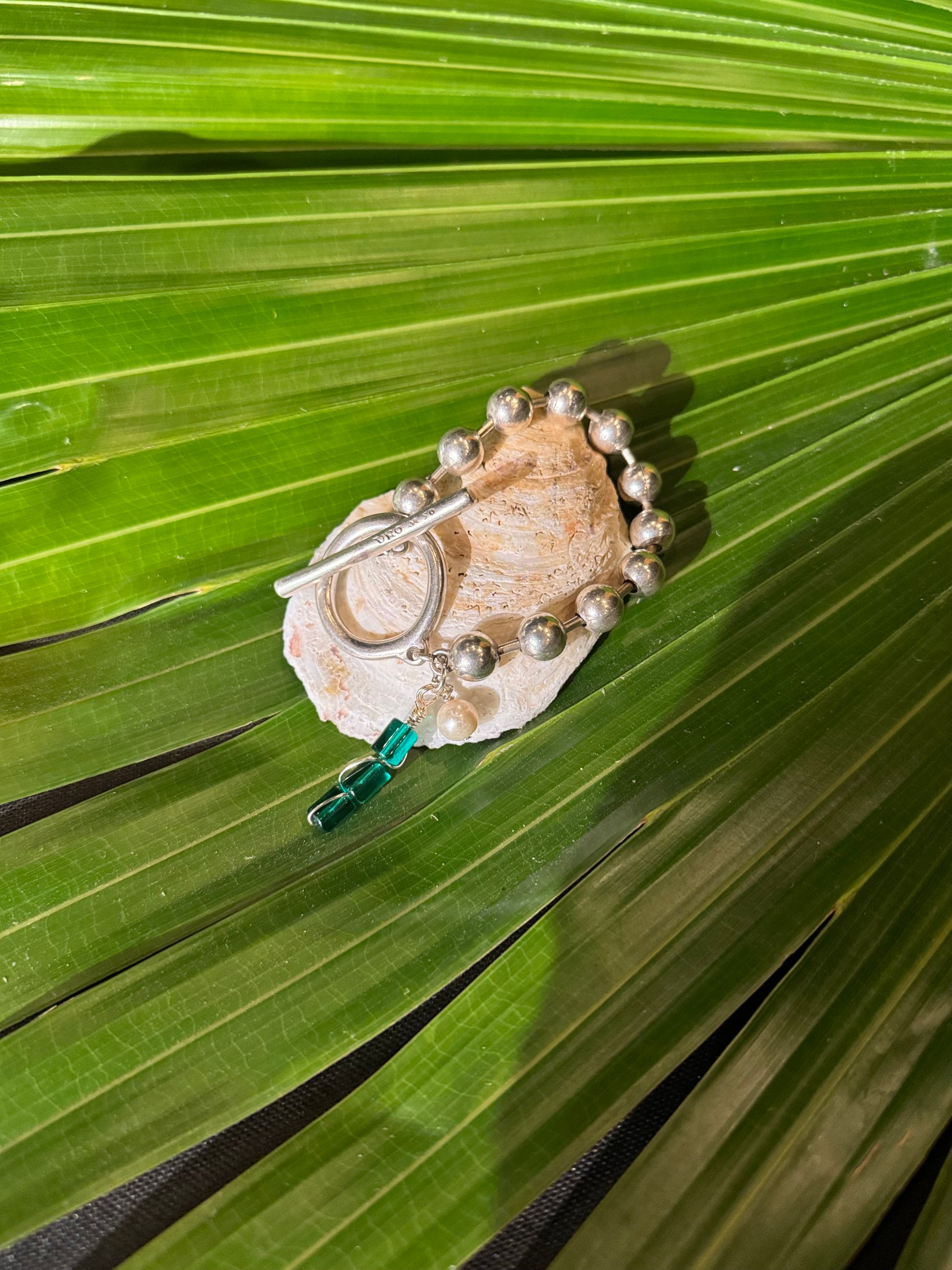 The Silver Ball and Circle Clasp Bracelet features a silver ball chain and a secure circle ring clasp. Adorned with teal green glass beads, this handmade accessory utilizes repurposed materials, promoting sustainability. Its thoughtful design combines aesthetic appeal with practical durability, making it suitable for various occasions.